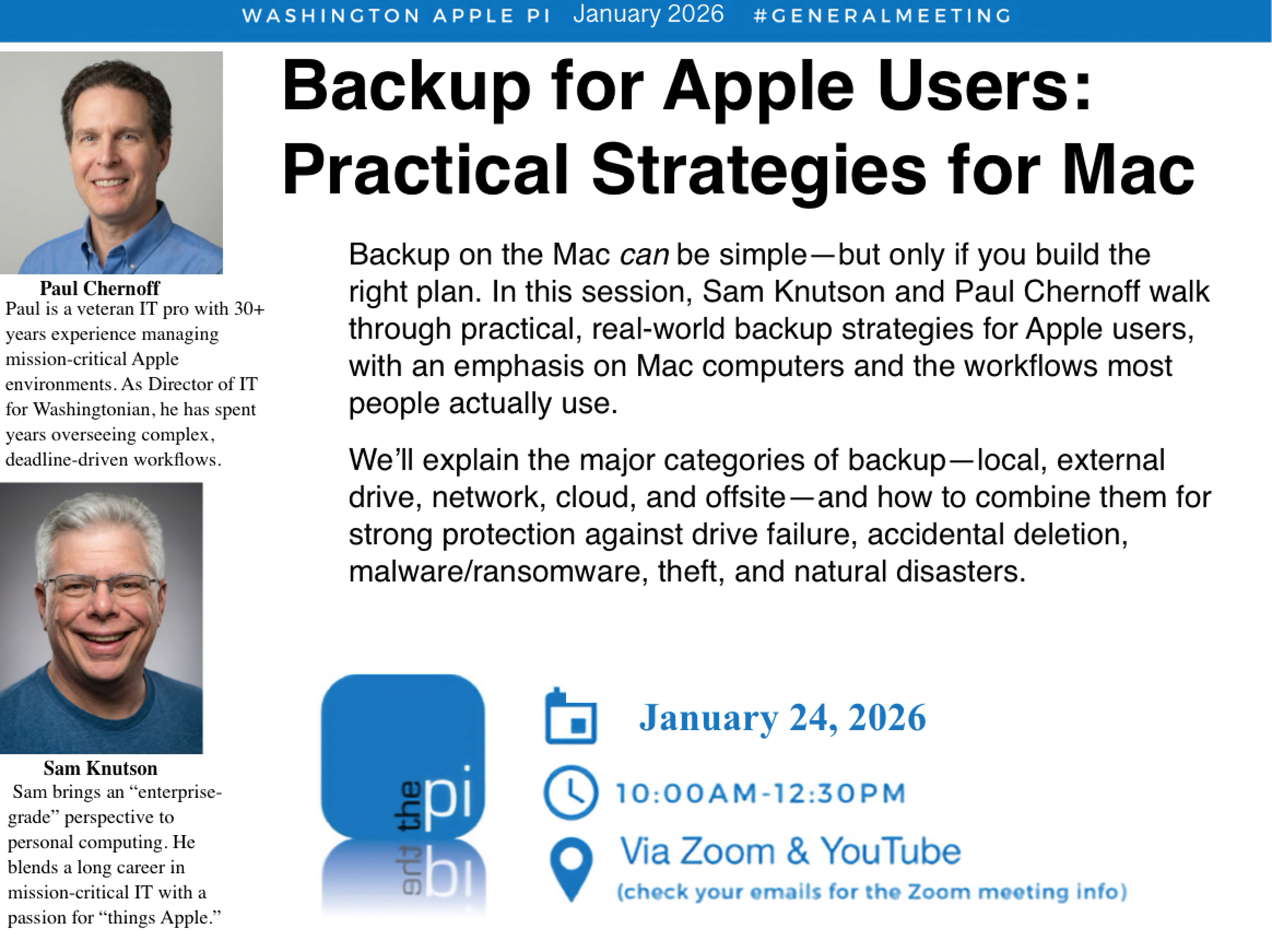 Backup on the Mac can be simple—but only if you build the right plan. In this session, Sam Knutson and Paul Chernoff walk through practical, real-world backup strategies for Apple users, with an emphasis on Mac computers and the workflows most people actually use.