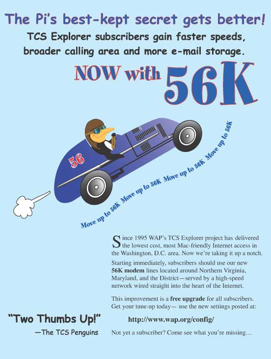 Washington Apple Pi's Mac-friendly ISP service, TCS Explorer, has been upgraded to 56K. You can admire the wonderful poster, below, or you can learn how to configure your modem and computer to use the service by visiting this page.