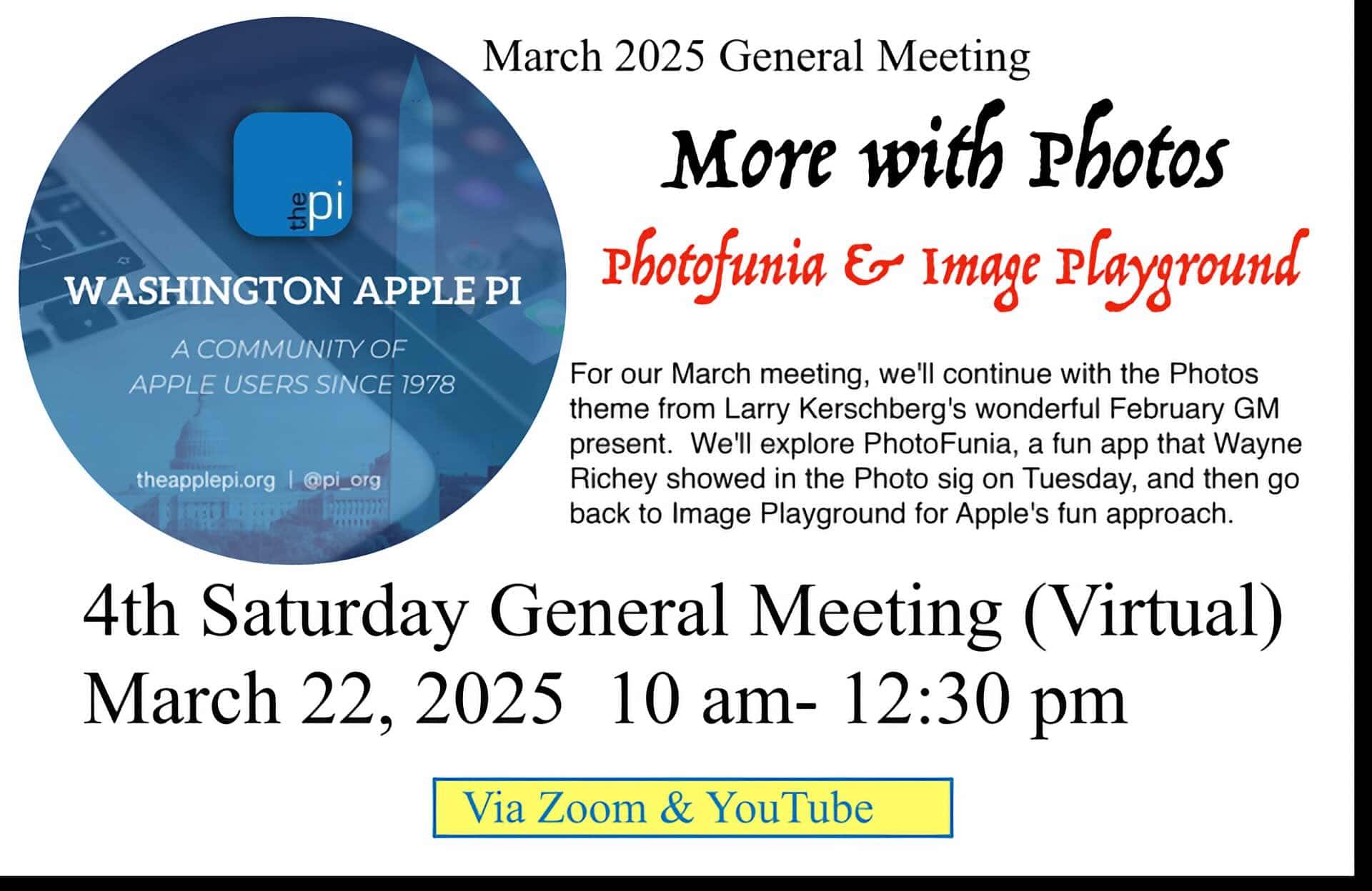 For our March meeting, we'll continue with the Photos theme from Larry Kerschberg's wonderful February presentation. We'll explore PhotoFunia, a fun photo application, and then go back to Image Playground for Apple's fun approach.