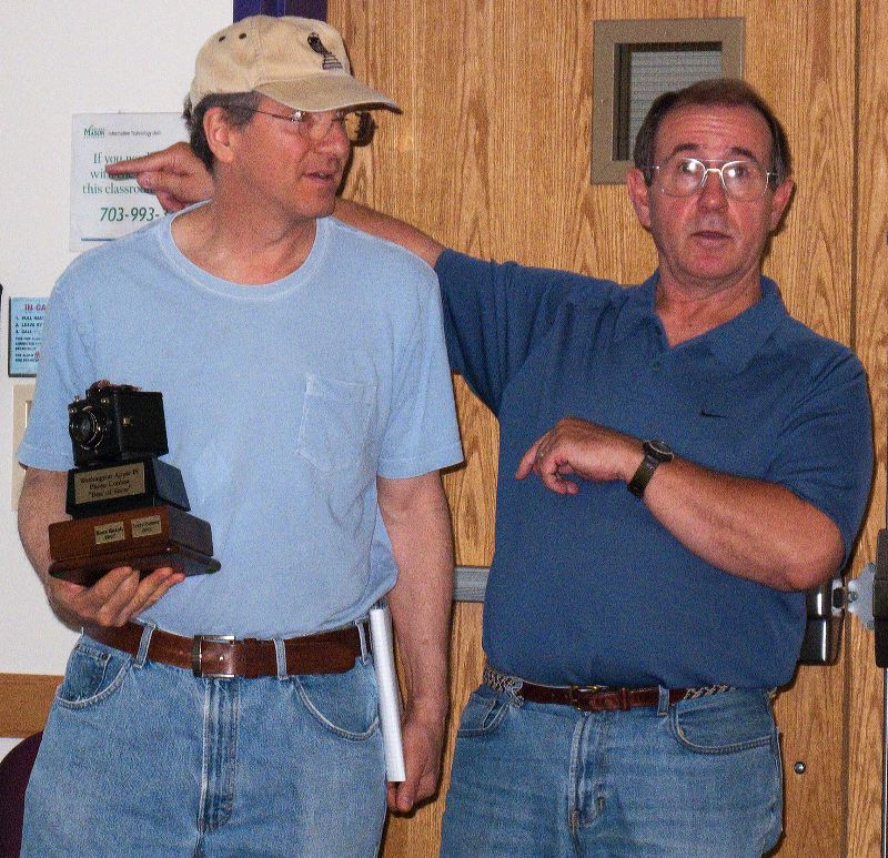 Robert "Bo" Huttinger sets up a Macintosh museum for the May 2009 General Meeting. Photo by Lawrence I. Charters.Bo Huttinger brought so much equipment that it wouldn't fit on the two tables; he set up two laptops on the floor below. Photo by Lawrence I. Charters.Two of the three Apple QuickTake cameras. These were not the first digital cameras, but their introduction greatly boosted the adoption of "consumer" digital cameras. The QuickTake 100, on the left, was introduced in 1994; the QuickTake 150 in 1995. Both were designed by Kodak, built by Chinon Industries. Photo by Lawrence I. Charters.Travis Good introduces Robert "Bo" Huttinger, setting up in the center, while President Bob Jarecke looks dubiously at his computer screen. Photo by Lawrence I. Charters.Robert "Bo" Huttinger delivered a very nice history of the Macintosh, complete with an ironic collection of startup and crash sounds. Note the screen is formatted to look like the front of an original Macintosh. Bo controlled the presentation via an application running on his iPhone, wirelessly talking to his laptop running Keynote. Photo by Lawrence I. Charters.At one point Bo demonstrated the very rare Apple Camera, an S-video device designed to be plugged directly into some models of the Macintosh Centris and Performa. Photo by Lawrence I. Charters.President Bob Jarecke presents "The Brownie" trophy for Best in Show at the Washington Apple Pi 2009 Photo Contest to Jerry Eisner. Travis Good attempts to disappear in the background. Photo by Lawrence I. Charters.Unaware that the video projector was shining on his face during the presentation, Bob Jarecke offers to move to the right, where he would be more fully exposed by the video projector. Photo by Lawrence I. Charters.An Apple Color OneScanner 600/27 with a Color StyleWriter 2200 on top, next to a PowerBook Duo 270c laptop. A Newton MessagePad 2000 rests in front. Photo by Lawrence I. Charters.A Macintosh SE with a 40 MB drive displays the sheer raw power available in 1987. Photo by Lawrence I. Charters.Closeup of Bo's rare Apple Camera. Photo by Lawrence I. Charters.A monitor connected to a Macintosh Performa displays the color video image provided by the Apple Camera. Photo by Lawrence I. Charters.Apple Education representative Aaron Davis gave the Pi an update on Apple's financial strength (excellent), Macintosh sales (growing), iPod and iPhone sales (growing), and general outlook (positive). He then capsulized what is known about the forthcoming iPhone 3.0 upgrade, and the forthcoming Mac OS X Snow Leopard operating system. Photo by Lawrence I. Charters.Not mentioned in other photos: the black Mac in the center is a rare Macintosh TV (complete with built-in Sony Trinitron screen). The flying saucer thing to the right is a PowerCD, an external CD that came with a remote control and speakers, and could be operated independently of a computer. The small camera ot the right of it is a QuickTake 200, made by Fuji Film. Photo by Lawrence I. Charters.May 2009 was the first General Meeting held at George Mason University. He, along with James Madison, was responsible for the Bill of Rights, founded on his previous work drafting the Virginia Declaration of Rights in 1776. Photo by Lawrence I. Charters.