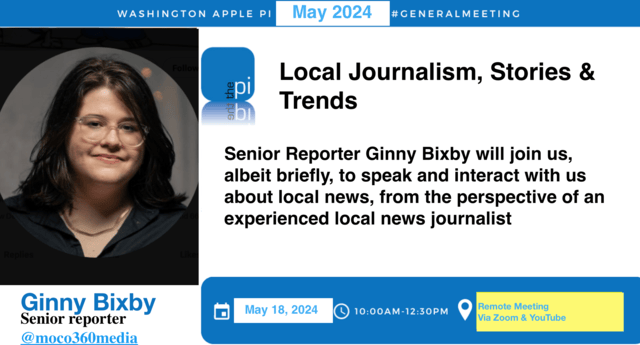The Pi has always moved up the May meeting a week, so it wouldn't fall on Memorial Day weekend. But this year, by doing so we blundered into the week of the Maryland 2024 Primary Day yesterday. And of course, our local news journo Ginny Bixby has been immersed in this and still is with her extensive local coverage! So instead of a whole morning and formal present, we'll make do with a half hour, that will be brief but hopefully fun. So Ginny will give a brief talk and then interact with us from 10:30 to 11 am on Saturday. Please make plans to come early to not miss her talk!
