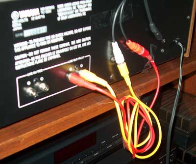 P2. Cables going from the line out connections in back of the cassette deck, through extension cables, to the mini-jack. (Photo by Mark Davis, taken with an HP Photosmart 812xi digital camera.)