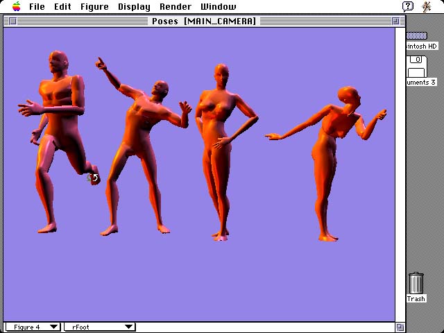 Screen Shot 2 shows the male figure in Outline; Screen Shot 1 shows two male and two female figures in Smooth rendering; and Screen Shot 3 shows the figures in Muscle rendering. In Screen Shots 1 and 3 a pale blue background was imported. Any PICT file may be inported as a background. Screen Shot 4 is an example.