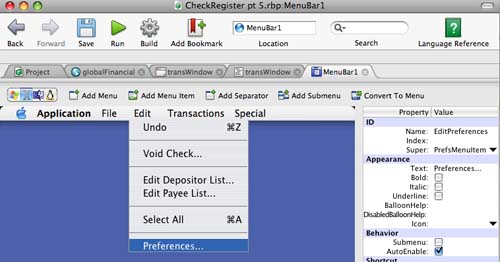The only remaining task is to get the preferences window to open. As you know the Preferences menu item always appears in the Apple menu but RB doesn't have a way to place any menu item in the Apple menu. Instead, RB places the Preferences menu item in the Edit menu, and in the Property/Value table its Super is set to PrefsMenuItem (See Figure 2). This tells RB that when the application is compiled, the Preferences menu item must appear in the Apple menu.