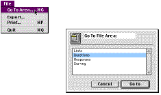 After opening the file, the user enters the survey questions. Select Go To Area from the File menu and then double-click on "Questions" in the Go To Area dialog (see Figure 1). An question browser will appear. The user presses command-N to enter a new question. A number may be up to 5 characters and made up of both numbers and letters. A question may be up to 32,000 characters. If a predefined list is used, it is also entered. The user then saves the question and continues entering new ones.