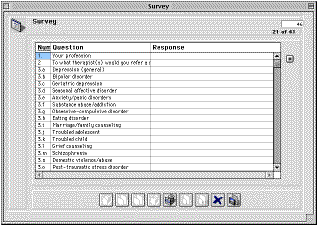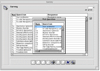 The user can sort the table by any of its three fields by clicking on the table header. In the Top Psychotherapist, survey, most of the answers are the names of healthcare professionals, and many people enter the same name for multiple questions. The data entry person can click on the Response heading after entering a single survey to see if a person's name was entered in a consistent manner. When a survey response has been completed, the user either presses on the Accept button or presses the Enter key. The data is saved and a new data entry form appears on the screen. When a data entry session is completed, the user presses on the Cancel button or presses command-period keys.