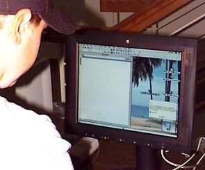 Seen from the front, the Apple Studio Display is bright enough to seriously confuse an automatic camera: the screen is nicely exposed, but most of the rest of the picture is underexposed. Aside from being bright, with crisp images, the display takes up very little desktop space: if you can't justify it for some other reason, tell your boss you need the extra desk space. The translucent plastic casing is most obvious when seen from behind. While nobody disliked this style case, there was a raging debate about its origins: is this a Retro look, a tribute to the 1950s? Or is this a Techno look, an American version of the European art trend? |